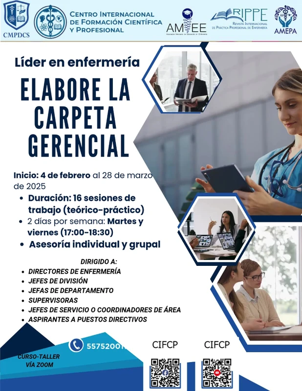 En este año 2025; 🌟 ¡Transforme su carrera y prepárese para liderar en el ámbito de la Enfermería! 📢 Debido al éxito y la alta demanda, hemos decidido abrir un nuevo grupo para el curso de la Carpeta Gerencial, especialmente diseñado para líderes de Enfermería y aspirantes a puestos directivos. Este curso te ayudará a potenciar tus habilidades gerenciales y a tomar decisiones estratégicas dentro del sector de la salud. 📅 Iniciamos el 4 de febrero Fecha: 4 de febrero de 2025 al 28 de marzo de 2025 Horario: Martes y viernes de 17:00 a 18:30 (sesiones virtuales por Zoom) Duración: 16 sesiones Modalidad: 100% online – Las sesiones son grabadas y se comparten por si no puedes asistir en vivo. 🚀 ¡Lo que aprenderás! A través de este curso, trabajaremos juntos en temas esenciales para desarrollar tu liderazgo y habilidades de gestión: Diagnóstico Situacional: Aprende a evaluar y analizar las necesidades de tu unidad. Plan de Supervisión: Desarrolla estrategias eficaces para supervisar el desempeño del personal. Distribución de Personal de Enfermería: Aprende a gestionar el recurso humano de forma eficiente. Análisis de la Transición del Modelo de salud: Entiende los cambios en el modelo de atención y cómo implementarlos. Además, participarás en un grupo conformado por líderes del IMSS. IMSS bienestar, ISSSTE, Secretaría de Salud, Universidades e instituciones privadas de todo el país. ¡Una excelente oportunidad para crear redes de contacto y compartir experiencias! 🎓 Beneficios: Constancia de participación por 60 horas. Aprendizaje práctico y aplicable a tu contexto laboral. Acceso a una red de profesionales de la salud y la administración sanitaria. 💥 ¡Aprovecha nuestra beca! ¡Ahora con un descuento del 50%! en lugar de 5000, realiza un pago único de 2,500 y asegura tu lugar en este curso de alto nivel. También puedes regístrate con $2,000 y realizar el pago de $500 en la siguiente quincena 📌 También puede enviar un mensaje al 5575200119